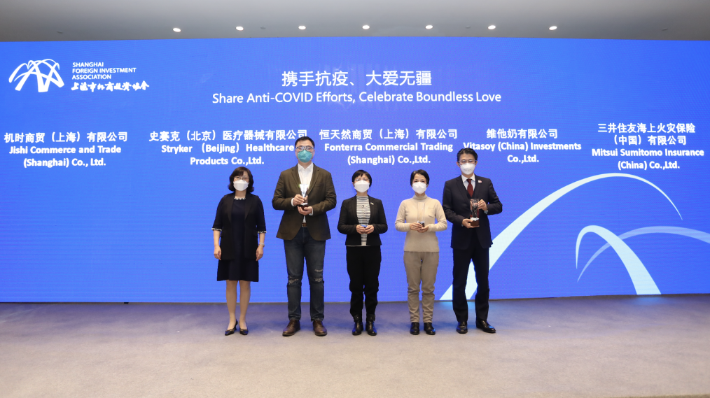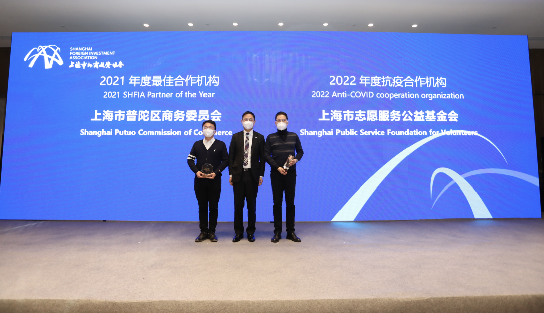 黄峰会长还向协会2021年度的最佳合作机构普陀区商务委和2022年度抗疫合作机构上海市志愿服务公益基金会表达了真挚的感谢。