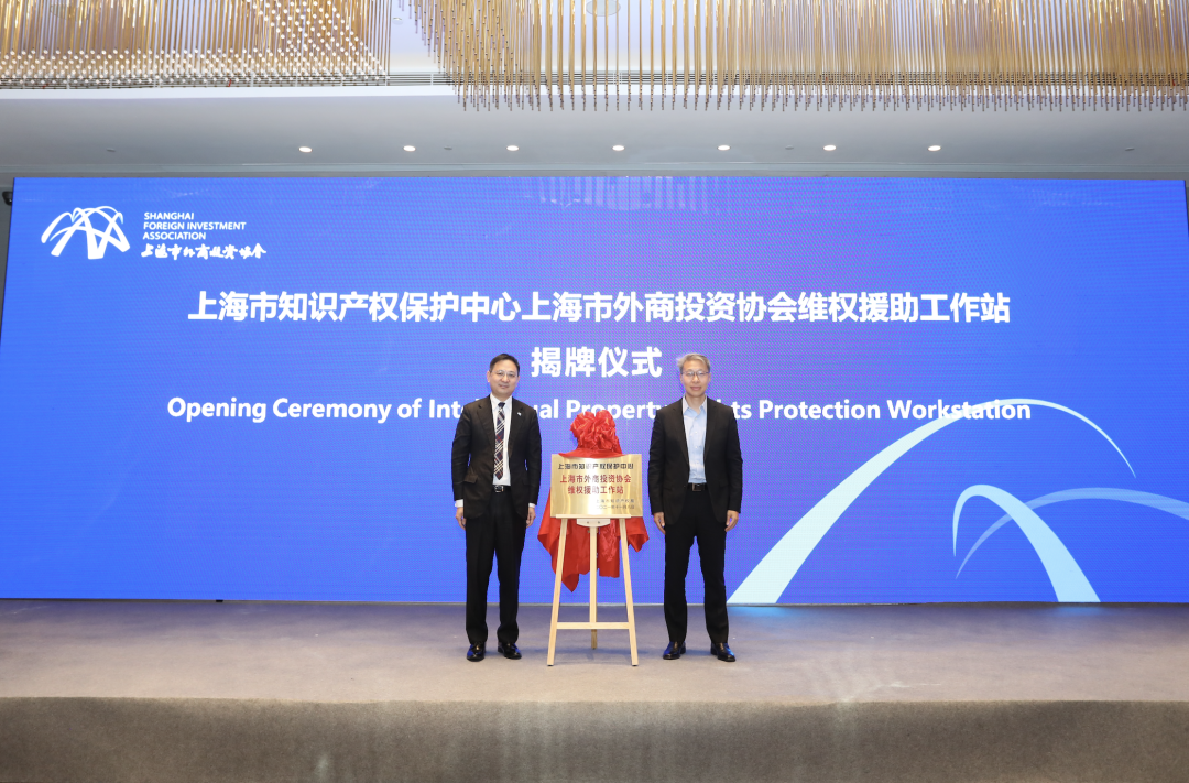 上海市知识产权局知识产权保护处凌捷副处长和黄峰会长为上海市知识产权保护中心上海市外商投资协会维权援助工作站揭牌。