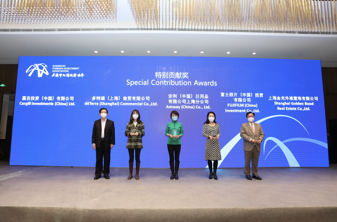 颁奖环节中,刘生副会长兼秘书长向2021年度为协会做出突出贡献的上海金光外滩置地有限公司、富士胶片(中国)投资有限公司、多特瑞(上海)商贸有限公司、嘉吉投资(中国)有限公司4家到场会员企业颁发了特别贡献奖。