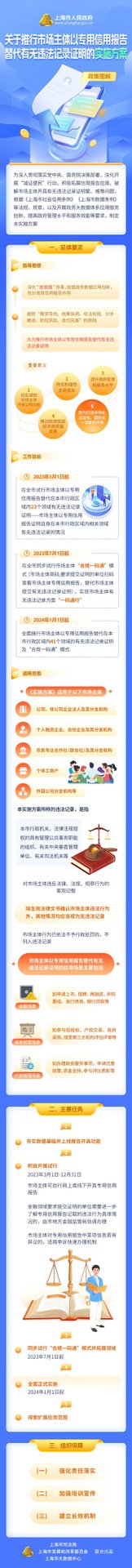 市司法局、市发展改革委介绍,2022年,浦东新区当时正在探索的“以信用报告替代行政合规证明”举措发挥了重要助力作用,为企业上市节省了大量宝贵时间。日前,上海市政府印发《关于推行市场主体以专用信用报告替代有无违法记录证明的实施方案》(下简称《方案》),在全市推行市场主体用专用信用报告替代有无违法记录证明。详见↓